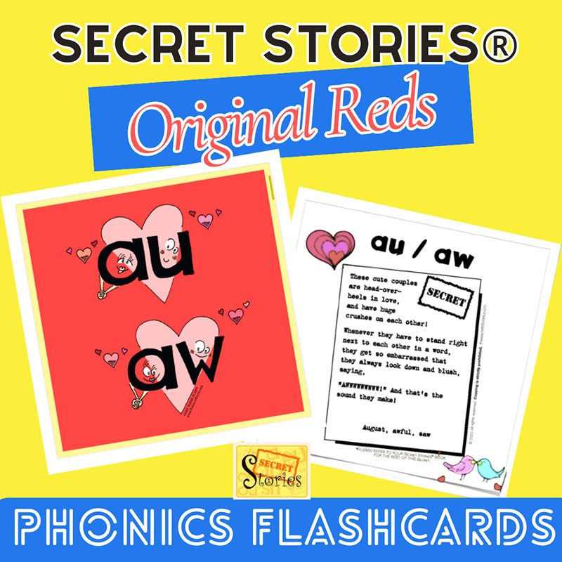 The Secret Stories® Brain Based Red Phonics Flashcards have the Secret Story embedded mnemonic sound image on the front and an abridged “story-starter” version of the phonics story on the back for quick reference. (Note: The flashcards do NOT include the complete stories with “next-most likely” sound defaults that are in the book.)